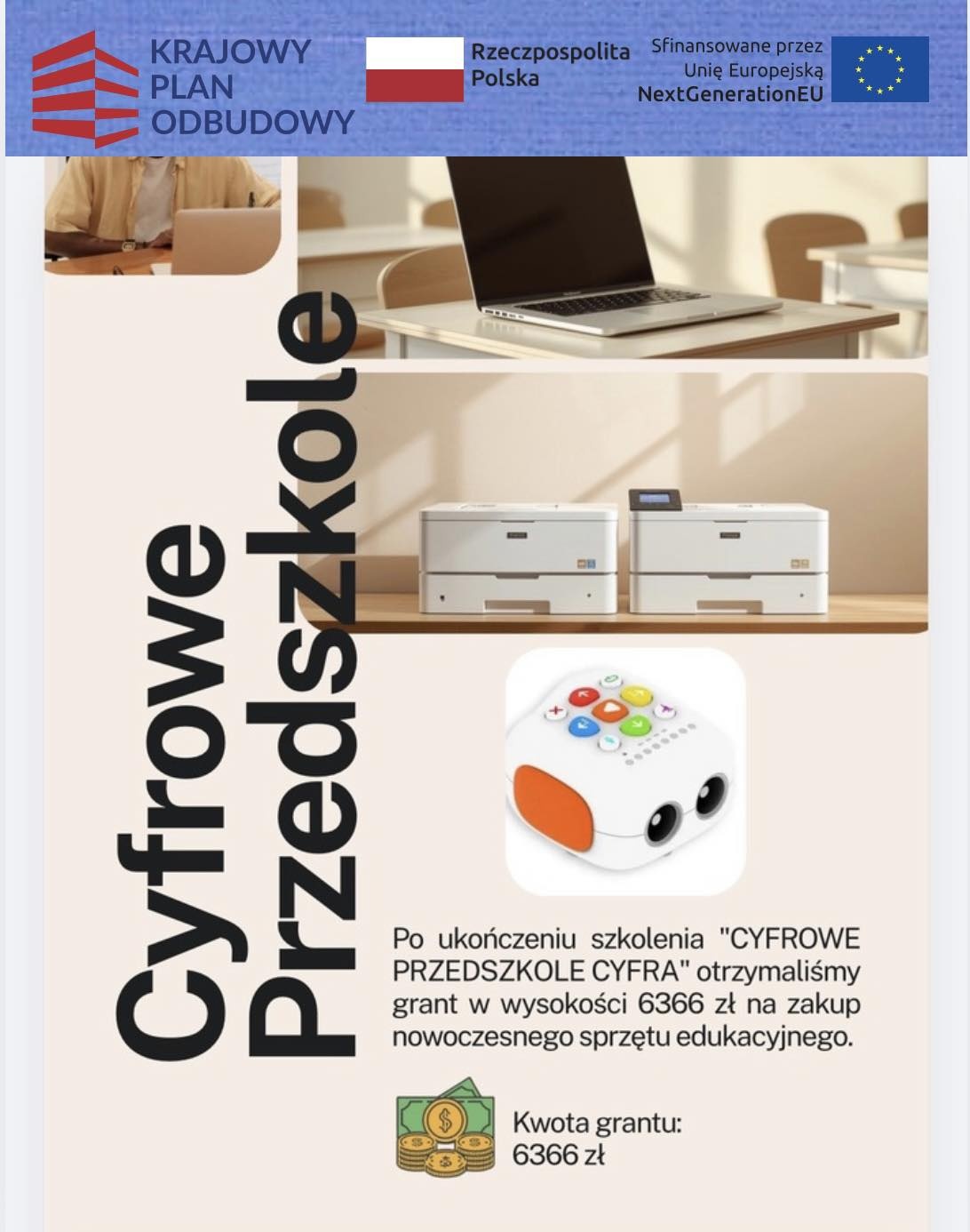Za otrzymany grant przedszkole zakupiło trzy drukarki, laptop oraz interaktywnego robota edukacyjnego „Zosia mała nauczycielka”
