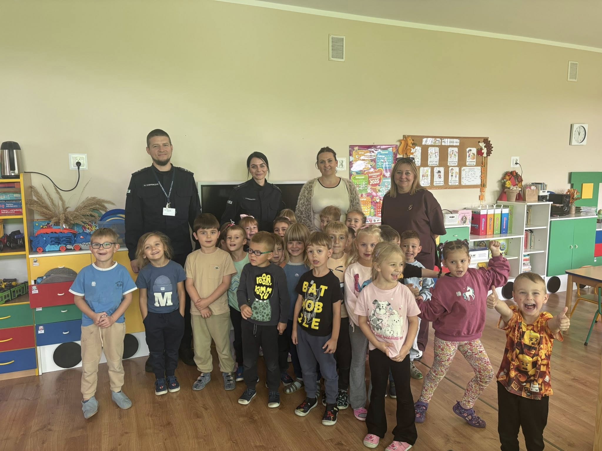 26 września nasze przedszkole odwiedzili policjanci z Komisariatu Policji w Trzciance. Gościliśmy mł.asp. Karolinę Sochacką i asp. Macieja Kasperczaka. Policjanci przypomnieli przedszkolakom jak zachować bezpieczeństwo na drodze oraz przybliżyli tajniki pracy policjanta.